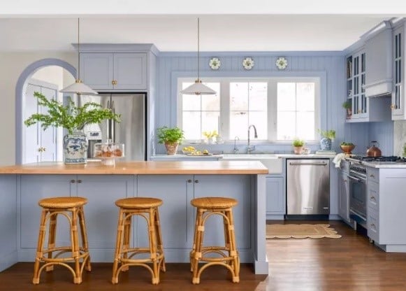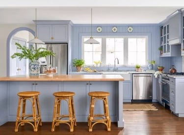 Though whites, creams, and browns are common, country kitchens are one of the styles that can be filled with muted color as well.
