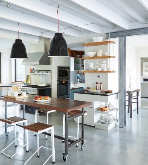 Large stainless steel, and often professional-grade, appliances give the vibe of a commercial kitchen. Other professional-style amenities include large steel sinks, pull-down faucets, open shelves, and hanging pot racks that offer handy storage. Gadgets and small appliances are often found stored on countertops, making industrial style a more busy, cluttered aesthetic but practical workspace.