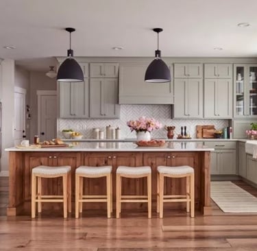 Transitional kitchen style pairs soft curves with sleek angles and accents soft hues with some darker shades but in a largely neutral color palette. Wood and stone are common elements of the neutral foundation, and together with a patterned backsplash, they give some texture to the room, too.